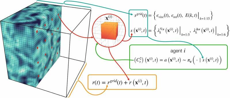 Schematic of multi-agent reinforcement learning (MARL) for modelling. The agents (marked by red cubes) execute a control policy that maximises the similarity between simulations. Credit: CSElab/ETH Zurich)