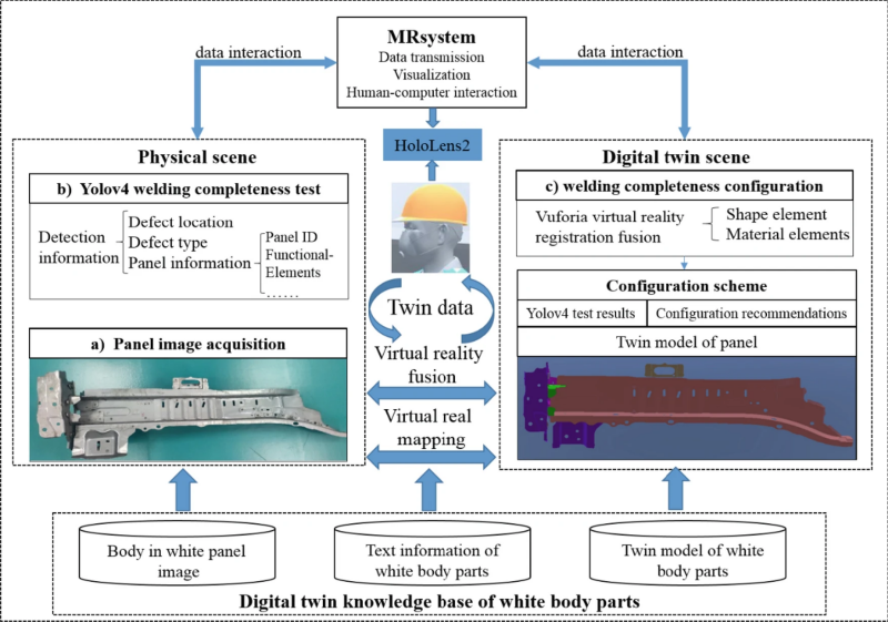 To address the problems of poor welding completeness and inefficient configuration for defective automotive body-in-white panels, we propose a method for detecting and configuring the welding completeness of automotive body-in-white panels based on digital twin (DT) and mixed reality (MR). The method uses DT to build an MR-oriented DT framework for the detections and configuration of body-in-white panel welding completeness. We propose a method to build a DT knowledge base for panels, a Yolov4-based welding completeness detection method, and a MR-based configuration method for the welding completeness in panels. Our team develop a panel welding completeness detection and configuration system to fully validate the effectiveness of the method. Find more here